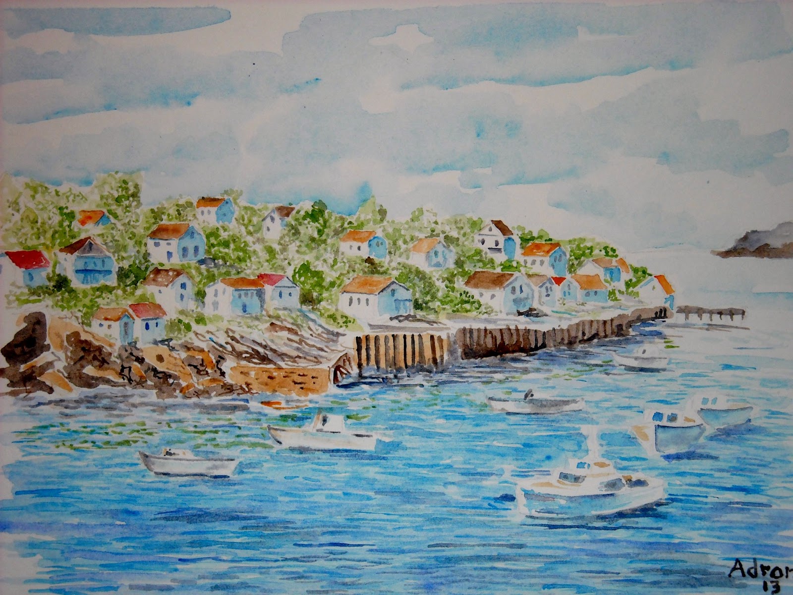 fishing village watercolor painting 15x11