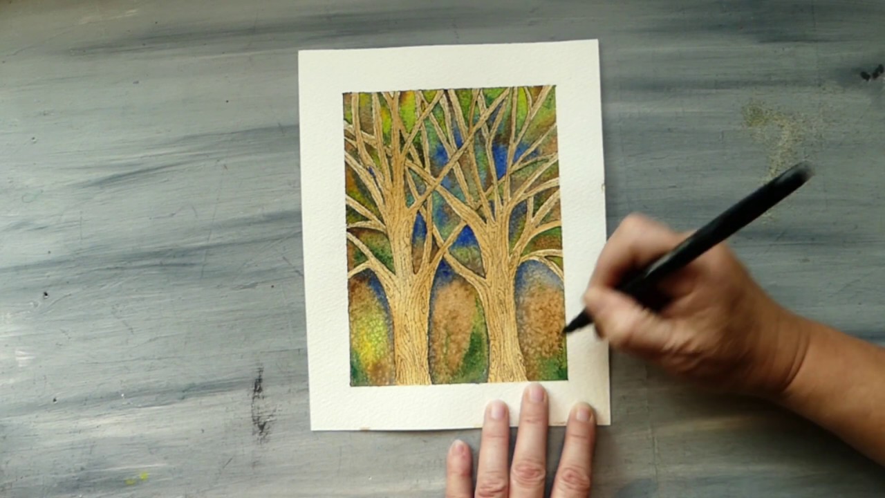 salt watercolor tape resist trees effect sprinkled water cardstock them children