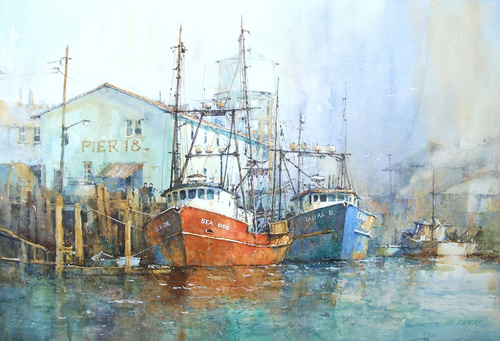 watercolor painting mist cartwright joe boats boat harbor rising water paint reflections paper paintings watercolour misty san sea scene diego