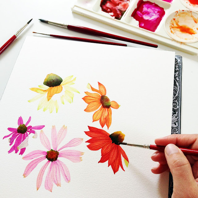 watercolor painting strawberry giant often block coneflowers